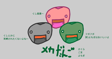 串だんごに対してライバル意識を持っているが、だんご3兄弟というCDが売れることで、その差は決定的な物になる。 永久にかなわないと知りつつも、串だんごに対して一方的なライバル意識を持ち続ける。 末っ子の「よもぎ」だけはその辺の事情がよくわかっていない。(おまけにフガフガしかしゃべれない) |