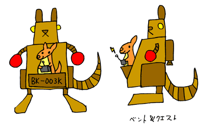 幼いときにハンターの銃によって親を亡くしたカンガルーの子供。 明らかにロボットのような親機に乗っているが、周りにはロボだとばれていないと思っている。 腹話術を使い、ひとりで親子両方のの会話をこなす。 本人が親の死を自覚してやっているのか、それとも悲しみのどん底で無意識に親の別人格が出現しているのかはわからない。 性格はサバサバしており、極めて明るい。 頭も良い。 |