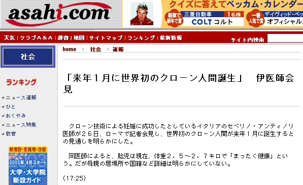 嘘か誠はともかくもうすぐ人のクローンが誕生するとか。