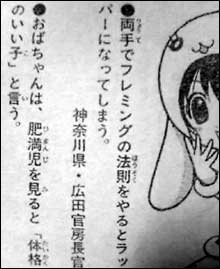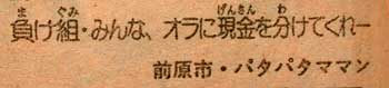 昨日の挨拶ですが、 ・「探偵!ナイトスクープ」の 桂 小枝さん ・磁石と言う若手のお笑い芸人さん ・吉本新喜劇で池野メダカさん が使ってました。 (THX>YAMさん、石井さん、macさん、MANSAさん、菜津奈さん、他) |