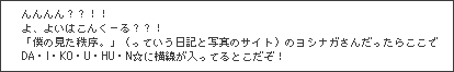 前のネタの 「あびる優、ダッシュだ。」というのは、 「あびる優、奪取だ。」のほうがいいのでは? (17:02 THX>B.W.さん、常連さん、孔明・さん、パピヨンさん、ホトトさん) |