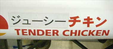 TENDER CHICKEN(テンダーチキン)という英単語の上に書かれていた 「ジューシーチキン」という強引な日本語。 「テンダー(柔らかい)」という単語はどこに行ってしまったのか。