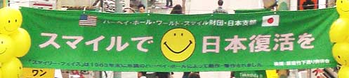 確かにスマイルは重要だと思うが、 復活という言葉は通常死んだような状態になっていなければ使わないはず。 もしかするとこの垂れ幕は、暗に今の日本が死んでいるっぽいことを表しているのだろうか。