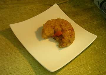 おまけに、中身をしっかりと見せたかったのだろうか? おにぎりの1/4がもぎ取られているため、誰かがかじったような状態。 しかも長時間照明に当たることで表面はカピカピになり悲劇の感じは増している。