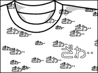 個性的な顔の形の他にも下記のように 「ざわ ざわ」 という特徴的な緊張感の描写が有名だ。 この「ざわ ざわ」は人気のあまり、Tシャツにもなったほどである。