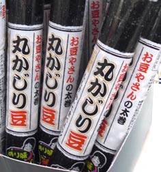 まさかの商品名、「丸かじり豆」。そして恵方巻の形。 よく見ると、寿司の形なのはビニールだけで、 中に入っているのは普通の豆(のり味)だ。