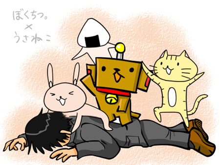 以前紹介した「うさねこ」本のまきのさんとコラボイラストを書いてみました。 (ヨシナガがうさ男に首を絞められているところ・・・?) まきのさん、ありがとうございました!