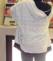 RIGHT(正しいこと)やLEFT(残されたもの)についてのカッコイイ文だと思うのだが、 パーカーのフードがもう少し下がって、「DETERMINE」の行まで来ることで、 こうなるのではないか。