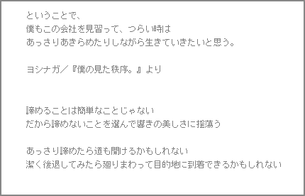なんと、「つらいときはあきらめよう」という ダメダメなネタ(僕秩の2008年1月22日)が、 すごくかっこいいセリフのような形で引用されていたのだ。