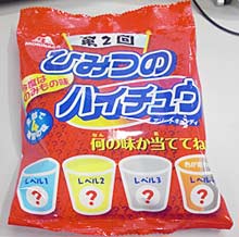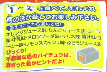 珍しいハイチュウを買った。 なんと、どんな味なのか食べるまでは全くわからず いくつかの候補の中から「味を当ててね」というのである。