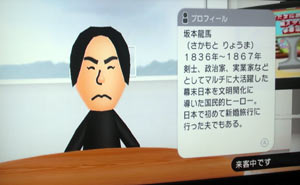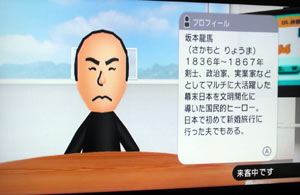 Wiiの間というソフトで遊んでいた。 Wiiの間は、上のように歴史上の偉人が自分の作った部屋を訪れたりする動画配信ソフト。 これは「坂本竜馬」さんが僕の部屋に来たところだ。