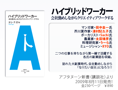 タイトルは「ハイブリッドワーカー」。 不況でたくさんの会社が「副業OKです」という発表を出す中、 ずっと普通のサラリーマンをやりながら、同時に個人サイト「僕秩」を作ってきた僕が 自分の経験を活かして、たくさんの著名人に