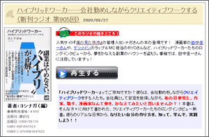 ■ 「ハイブリッドワーカー」がラジオ&メルマガに (この記事への固定リンク) さて、おかげさまでうれしい反響をたくさん頂いているハイブリッドワーカーですが、 新刊を紹介するラジオに取り上げていただきました! 音声で本の紹介をすると、たった数分で内容が頭に入ってくることにビックリです。
