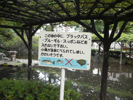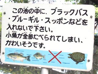 そこに書かれた放流禁止の看板。 小さな公園の池ではあまり見ない看板だが、 真に見るべきは禁止している種類だ。