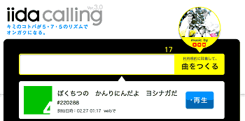 ■ 男の戦い (この記事への固定リンク)(THX>眩暈さん) iidaのサイトで、自分が入力した言葉を歌にしてくれるキャンペーンをやっている。