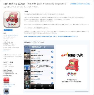 このアプリ、動画の閲覧はもちろんですが、なんと自分のiPhoneで撮影した動画を 簡単にNHKのホームページに送信することも出来ます。(3GSのみ) つまり、iPhoneさえ持ち歩いていれば、なにげなく撮影した動画がすぐに地上波で オンエアされる可能性があるのです(!)