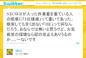 この書き込みでは、「HE撲滅」と書かれた作業着を着た人がいたので、 「HE」って何だろう?、と書いたところ、多くの方から 「HUMAN ERROR(ヒューマンエラー)」の略ではないか、とのご意見を頂いたのである。