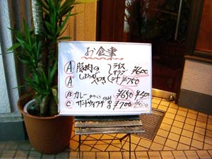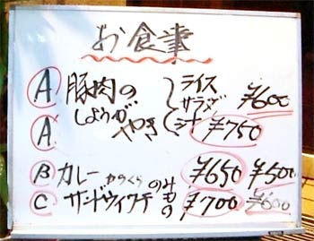 同様に、その下の「カレー からくちのみ」、「サンドウィツチ」の価格も 2種類提示されている。 これだけでは、どの料理が何円なのか全く検討がつかないという、かなり斬新な戦法だ。