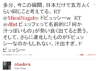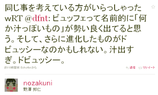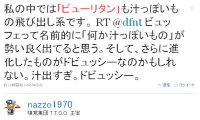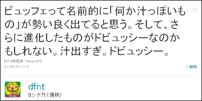 「ド」のところで噴出が始まって、「ビュッシー!」ですごく出ている気がする。 その勢いたるや、既存の日本語には感じられない凄みすら感じるだろう。 同じような汁の噴出を感じる言葉には、「ビュッフェ」があるが、こちらは噴出が少ないと言わざるを得ない。