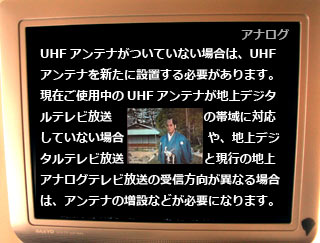 2年前まで右上に「アナログ」と表示されているだけだった気がするのだが、 いつの間にか上下にもお知らせが出ており、左右にも黒。 結果的にメイン画面が80%くらいに縮小されてしまっている。 これでは、32インチのテレビでも26インチくらいの臨場感しか楽しめない。