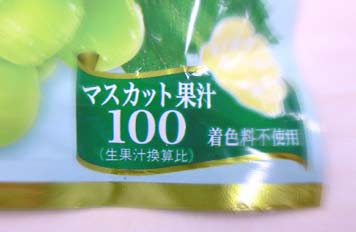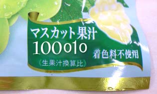 そこに書かれていた、果汁100%のような表記。 だがよく見てみよう。「マスカット果汁 100」だ。パーセントがない。