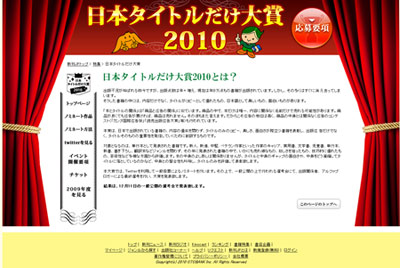 ■ 日本タイトルだけ大賞2010 (この記事への固定リンク) 今年も去年に引き続き、「日本タイトルだけ大賞」というイベントを行いますよ。 本を読まずに、タイトルだけで賞を与える、という革新的な(笑)イベントです。