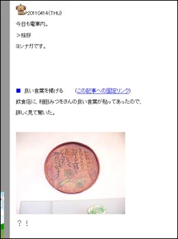 ※日付をクリックすると直接飛べます ※読み込みに少し時間がかかります。 ※URL末尾の#20110425などの日付タグに自動で飛ばない時は 左の日付を直接クリックしてみて下さいね。 |
