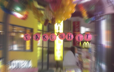 パンパンに空気が入ったほかの風船と比べ、 明らかに空気が抜けている「A」の風船。 このままではまずい。 このまま空気が抜けて「A」の判別ができなくなったら、 その時竹下通りの入り口は、本当の意味で「TAKE SHIT」になってしまう・・・!