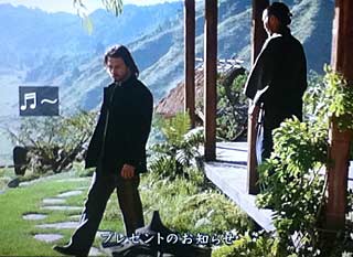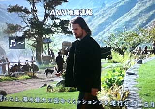 ♪〜の中で震度を解説するラストサムライ。 神妙な顔でついて来る武士。