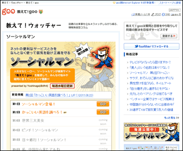 ■ ソーシャルマンが教えて!gooに掲載されます (この記事への固定リンク) さて、ソーシャルマンが、「教えて!goo」の中で配信されることになりました。 (ソーシャルマンが当初から「Yahoo!知恵袋」ではなく「教えて!goo」を使っているのはそういう理由だったのです(笑))