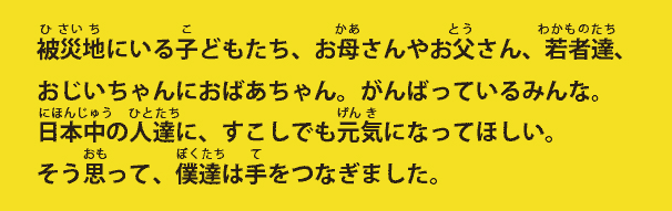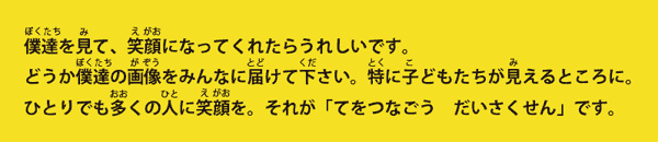 ■ てをつなごう。 (この記事への固定リンク) 「てをつなごう だいさくせん」という取り組みのページを見た。 このプロジェクトはこんな内容だ。