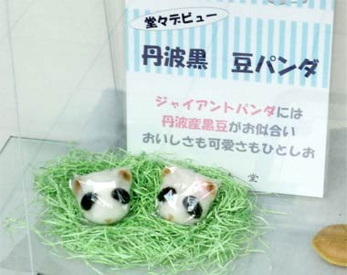 そこにあったすごい和菓子。見ると 「ジャイアントパンダには丹波産黒豆がお似合い」 と書いてある。