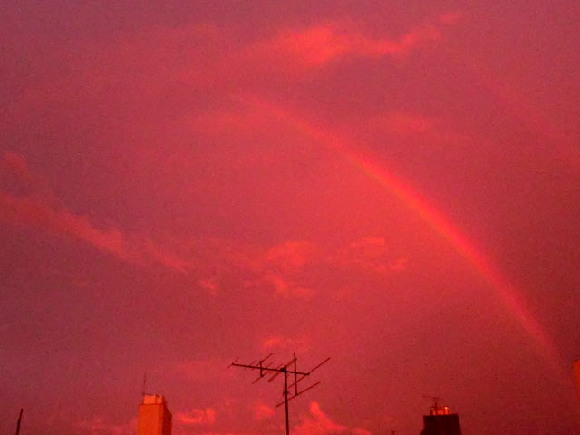 赤い空 朝焼けの中の虹は初めて見ましたよ。