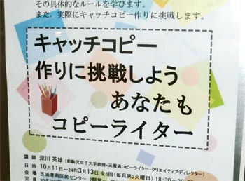 ■ キャッチコピー作りのキャッチコピー (この記事への固定リンク) 掲示板に貼られていた 「キャッチコピー作成講座」のポスターを見て驚いた。