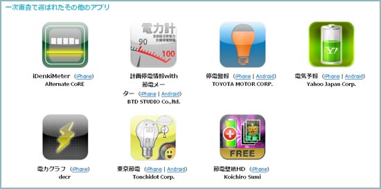この中で「2011節電スマートフォンアプリ大賞」というものがあるのですが、 以前知人の角くんと作った「節電壁紙。」というアプリが、一次審査の7作品に選ばれていました。