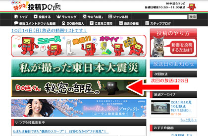 さて、ヨシナガがお手伝いをさせていただいているNHKの 「特ダネ!投稿DO画」ですが、本日ホームページがリニューアルしました! この中に、よく見ると「DO画くん 秘密の部屋。」という