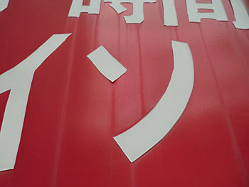 おそらく、大きなビニールシートの上にワープロの文字を拡大したものをおき、 ハサミで切ったのだろう。 当然、普通のコンピュータ文字と全く同じ形の文字パーツが出来上がるわけだが、