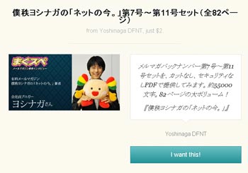 ■ メールマガジン「ネットの今。」 メルマガ、初めてます! 現在新サービス「はてなOne」の全員招待などをやっていますよ。 お申し込み当月は無料で、当月中に解約すれば完全無料ですので、 よろしければぜひお試し下さいー。 ボタンちぎれたっす。 >挨拶 ヨシナガです。