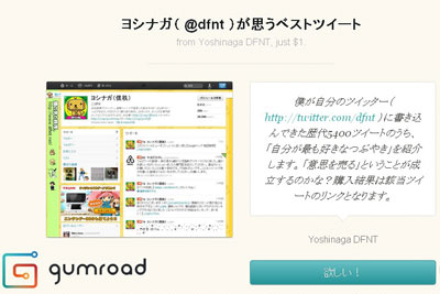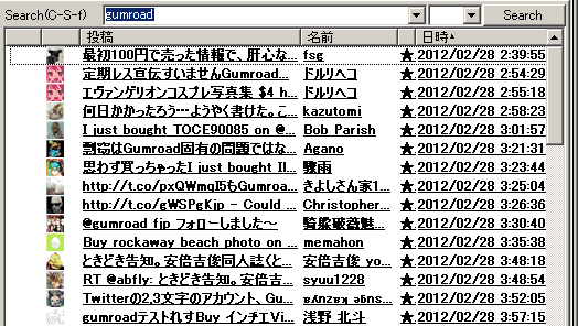 ■ ステマをしてみたよ (この記事への固定リンク) 2/13から、ツイッターの「gumroad」という言葉を含む呟きをずっと収集している。 こんな具合だ。