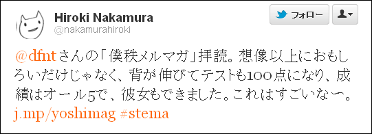 あまりにビックリしすぎたので記念にキャプチャしました。 堀江さんはずっとメルマガをやり続けているので、例えるなら マラソン選手の横を50mくらい全力疾走して一瞬並んだだけ という話なのですが、やってて良かったな、と思いました。