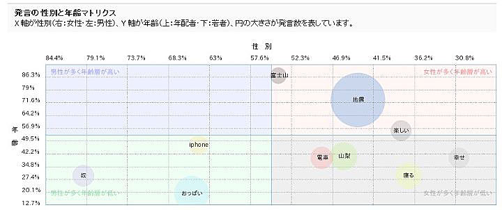 まさかの左下。 なんと、日本中の「ゆれた」という書き込みの関連ワードに「おっぱい」が入ってしまっていたのだ。 この日は山梨で地震が起きた日だったのだが、「山梨」よりも大きい。