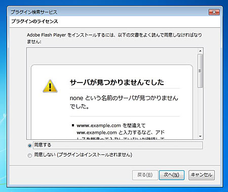 ・ ・ ・ と、いうことで 「サーバが見つからない」という内容に完全同意してインストールされた 僕のFlashPlayer。