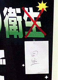 そこに書かれていた「衛生」の文字。 後からビニールテープとA4のコピー用紙によって修正されている。
