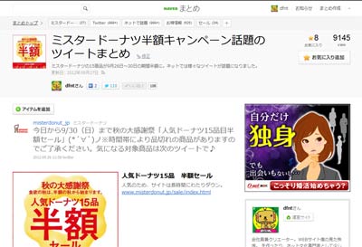 ■ ミスタードーナツ半額キャンペーン話題のツイートまとめ (この記事への固定リンク) 更新が遅れてタイミングずれちゃいましたが、 ミスドの半額キャンペーンに合わせて、ツイッターの書き込みが面白かったのでまとめました。
