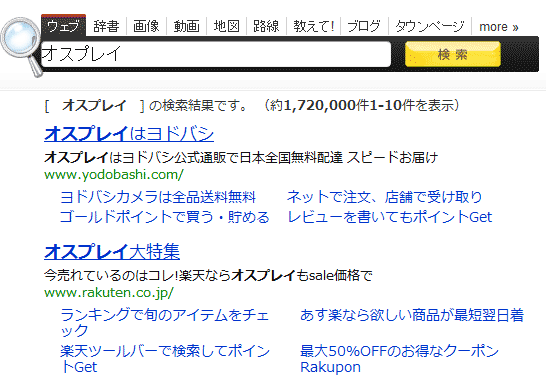 面白いので、「拳銃」「核兵器」「大陸間弾道ミサイル」「覚せい剤」など、 危険と思われるワードをたくさん検索したが、きれいにスポンサードリンクが出たのは オスプレイだけだった。