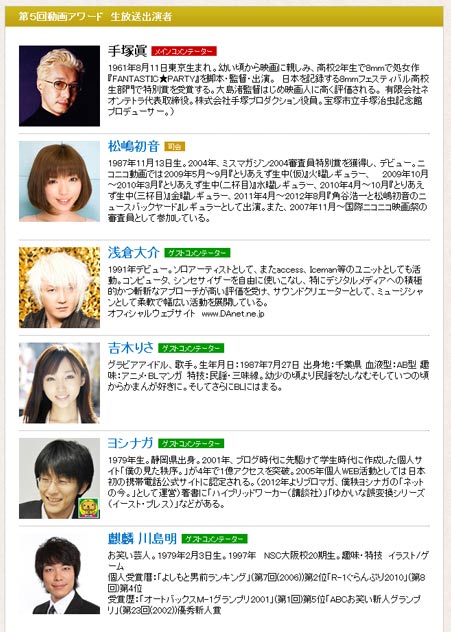 ニコニコの動画アワードでコメンテーターをしてきます。 手塚眞さん、松嶋初音さん、浅倉大介さん、吉木りささん、麒麟の川島さんと一緒です。