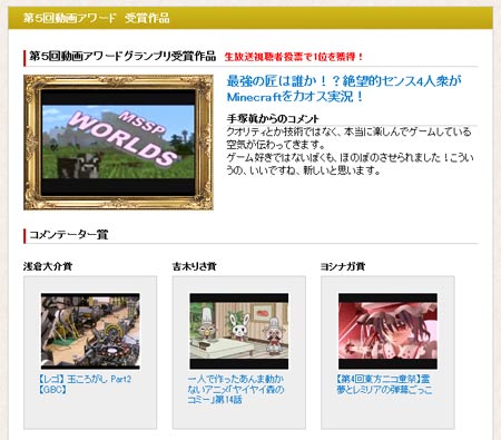 ■ 第5回動画アワード終了! (この記事への固定リンク) さて、コメンテーターとして出演させていただいた動画アワード、無事終了しました。 (視聴者12万人以上だったとのこと!)