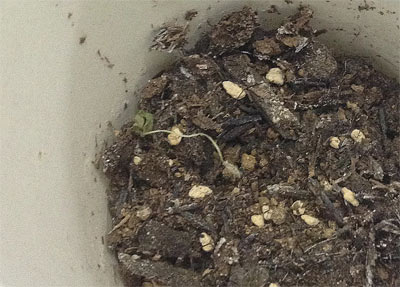 土日に水をやらずにいたら、土がパサパサになっていたのだ。 だが僕は負けない。 気づいてすぐ水をやることで、芽は再び活力を取り戻した。
