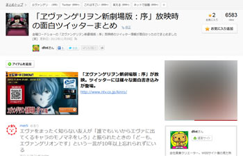 ■ 「ヱヴァンゲリヲン新劇場版:序」放映時の面白ツイッターまとめ (この記事への固定リンク) さて、EVAのテレビ放映に合わせてネットが盛り上がっていたので 恒例になりつつある金曜ロードショーまとめを作りました。