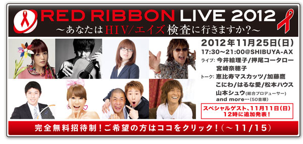 ■ レッドリボンライブ2012 (この記事への固定リンク) ヨシナガが毎年お手伝いしている、厚生労働省×TBS主催の「レッドリボンライブ」。 今年も参加者受付が始まりました。